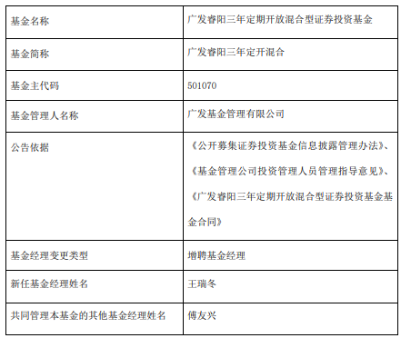中国经济网北京11月5日讯 今日,广发基金公告,广发睿阳三年定开混合增聘王瑞冬。