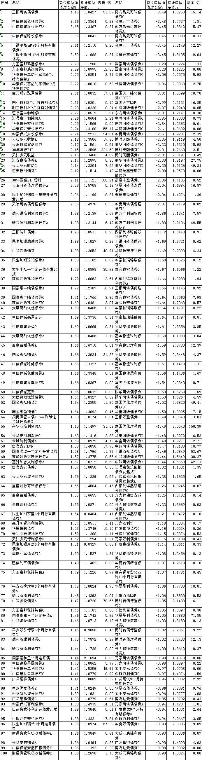 2025年10月债券型基金涨跌幅前100名