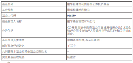 鹏华稳健增利债券增聘王石千 杨雅洁离任