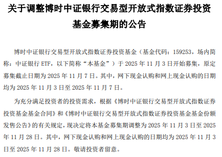 公告称,博时中证银行交易型开放式指数证券投资基金(基金代码:159253,场内简称:中证银行ETF)于2025年11月3日开始募集,原定募集截止日期为2025年11月7日。其中,网下现金认购和网上现金认购的日期均为2025年11月3日至2025年11月7日。