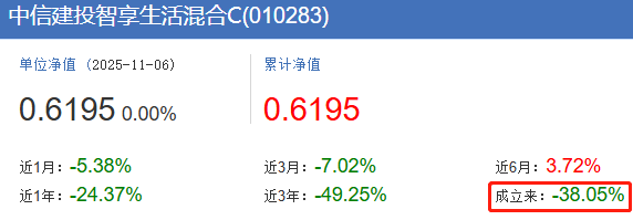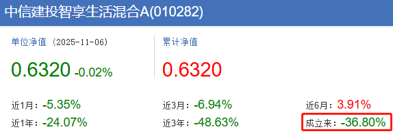 据悉,中信建投智享生活混合成立于2020年11月4日,然而到2025年11月6日的5年时间里,该基金的收益率竟然累计下跌了36.80%和38.05%,累计净值仅为0.6320元、0.6195元。如果从最近3年的收益率表现看,其跌幅更是接近50%。