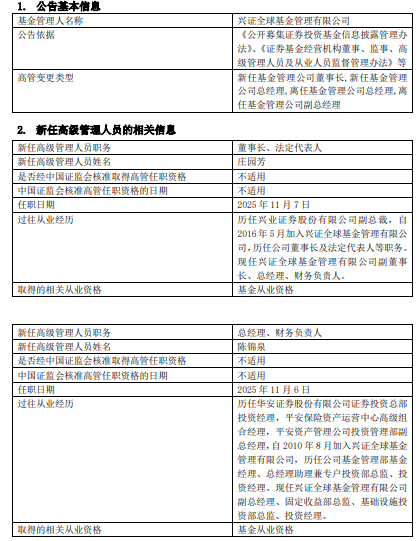 公告显示,庄园芳历任兴业证券股份有限公司副总裁,自2016年5月加入兴证全球基金管理有限公司,历任公司董事长及法定代表人等职务。现任兴证全球基金管理有限公司副董事长、总经理、财务负责人。