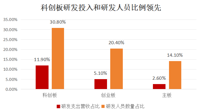 从研发投入来看,截至2024年末,科创板研发投入占总营收的比重达到了11.9%,大幅领先于创业板的5.1%和主板的2.6%。同时,科创板在研发人员数量占比上也以30.8%的比例领先于创业板(20.4%)及主板(14.1%)。