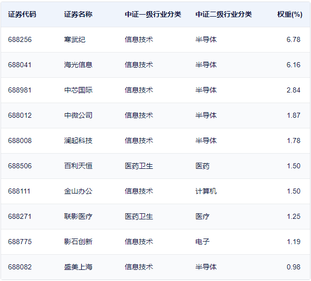 科创综指前十大权重股: