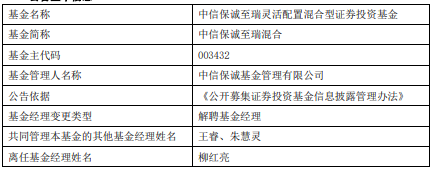 中国经济网北京11月13日讯 今日,中信保诚基金公告,柳红亮离任中信保诚至瑞混合。