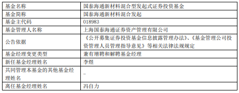 中国经济网北京11月13日讯 今日,上海国泰海通证券资产管理公告,冯自力离任国泰海通君得诚混合、国泰海通君得鑫2年持有混合、国泰海通新材料混合发起。