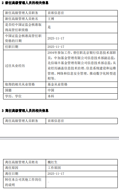 北信瑞丰基金首席信息官魏红生离任 王博继任