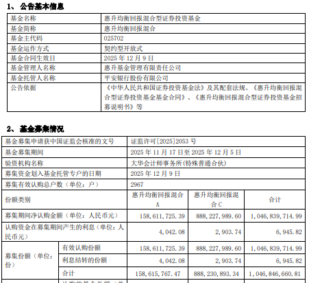 募集期间净认购金额1,046,839,714.99元,认购资金在募集期间产生的利息6,945.82元,募集份额合计1,046,846,660.81份。
