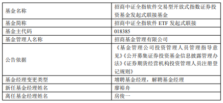 中国经济网北京12月11日讯 今日,招商基金公告,招商中证全指软件ETF发起式联接增聘廖裕舟,房俊一离任。