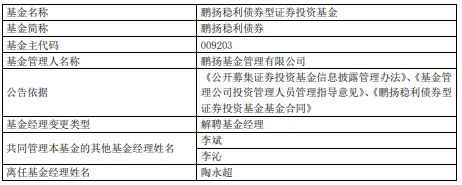 中国经济网北京12月12日讯 今日,鹏扬基金公告,陶永超离任鹏扬稳利债券、鹏扬景创混合。