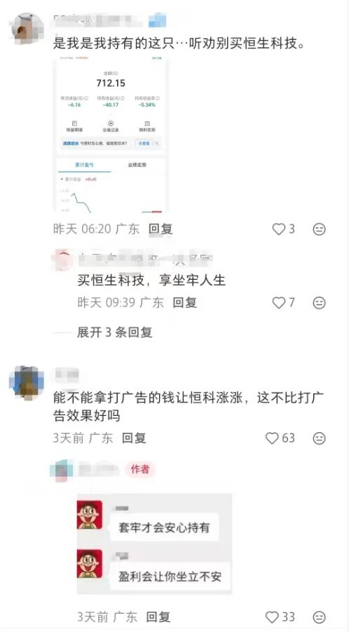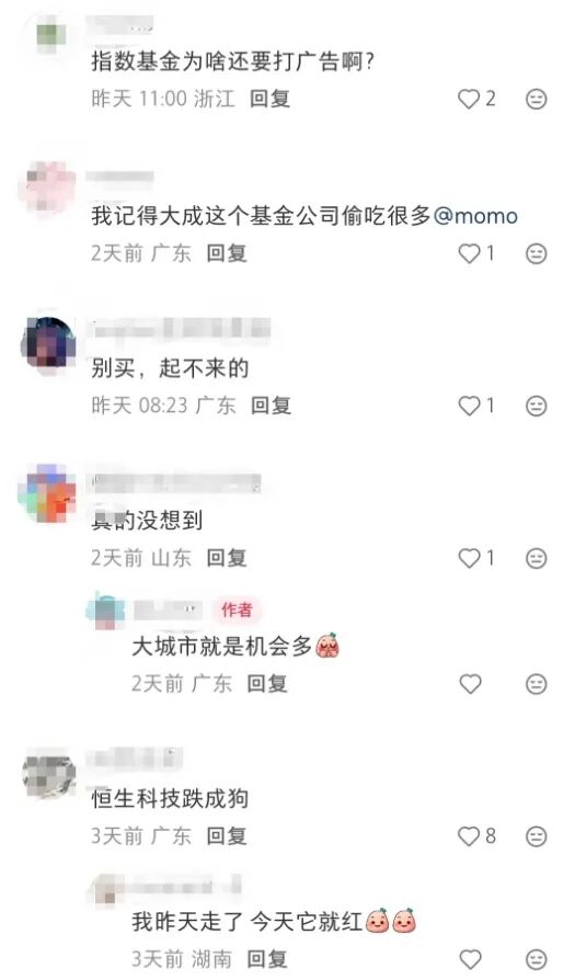 其中一位网友评论到:“能不能拿打广告的钱让恒科涨涨,这不比打广告效果好吗?”另有网友评论:“是我持有的这只,听劝别买恒生科技。”“指数基金为啥还要打广告啊?”“大成恒生科技跌跌不休啊。”