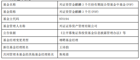 中国经济网北京12月15日讯 近日,兴证证券资产管理有限公司公告,兴证资管金麒麟3个月(FOF)增聘王诗韵。