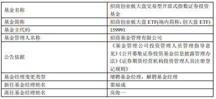 中国经济网北京12月16日讯 今日,招商基金公告,房俊一离任招商中证生物科技主题ETF、招商创业板大盘ETF,增聘窦福成管理。