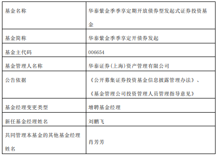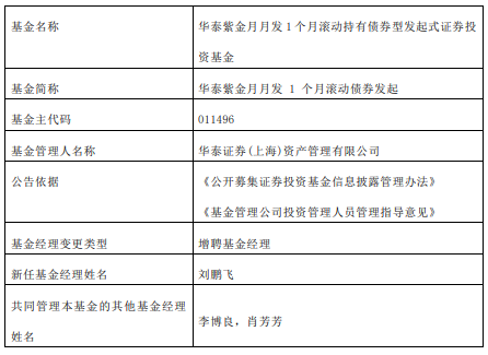 中国经济网北京12月16日讯 今日,华泰证券(上海)资产管理有限公司公告,华泰紫金月月发1个月滚动债券发起、华泰紫金季季享定开债券发起增聘刘鹏飞。