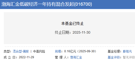 该基金《基金合同》生效日为2022年11月29日,《基金合同》生效之日起三年后的对应日为2025年11月29日。截至2025年11月29日,该基金的基金资产净值低于2亿元,已触发上述《基金合同》约定的终止情形,《基金合同》自动终止,基金管理人将根据相关法律法规、《基金合同》等规定对该基金进行清算,无需召开基金份额持有人大会。基金管理人于2025年11月29日披露了《关于渤海汇金低碳经济一年持有期混合型发起式证券投资基金基金合同终止及基金财产清算的公告》。