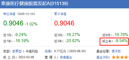 中国经济网北京12月17日讯 今日,新浪发布《牛市亏损!泰康基金:“医疗健康A”年内净值下跌12.54%,成立以来仍处于浮亏》一文。文中称,截至2025年12月15日,泰康医疗健康A年内净值下跌12.54%,成立3年多该基金净值累计跌超8%。该基金部分三季度末重仓股自四季度以来股价下跌超过30%,包括晶泰控股、方舟健客等。