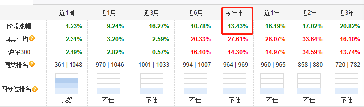 不仅如此,在成立至今的3年多里,该基金A/C份额的累计收益率也处于亏损状态,分别下跌9.54%和11.22%,累计单位净值仅有0.9046元、0.8878元。而且无论近3年、近2年、近1年,其排名均为不佳状态。