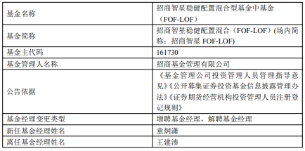 中国经济网北京12月18日讯 今日,招商基金公告,招商智星稳健配置混合(FOF-LOF)增聘童炯潇,王建渗离任。