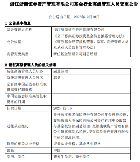 中国经济网北京12月18日讯 今日,浙江浙商证券资管公告,任命郭昊为副总经理。