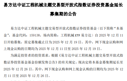 公告称,易方达中证工程机械主题交易型开放式指数证券投资基金(基金代码:159138,场内简称:工程机械ETF易方达)自2025年12月11开始募集,原定募集截止日为2025年12月19日。其中,网下现金认购和网上现金认购的日期均为2025年12月11日至2025年12月19日。现决定将该基金募集期延长至2025年12月26日。其中,网下现金认购和网上现金认购的日期均为2025年12月11日至2025年12月26日。