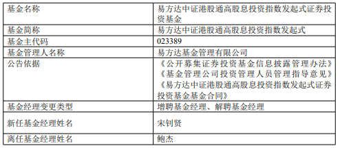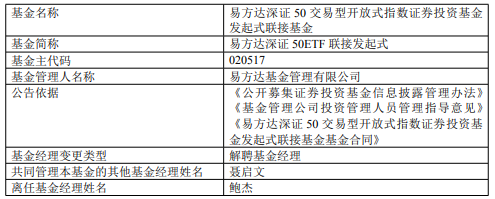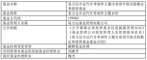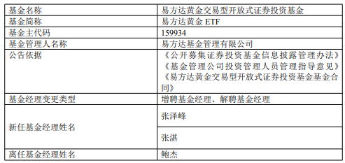 中国经济网北京12月22日讯 近日,易方达基金公告,鲍杰离任易方达中证红利价值ETF、易方达黄金 ETF 联接、易方达黄金ETF、易方达中证电信主题ETF、易方达中证电信主题ETF联接、易方达中证汽车零部件主题ETF联接发起式、易方达中证汽车零部件主题ETF、易方达中证港股通高股息投资指数发起式、易方达深证50ETF联接发起式、易方达深证50ETF。