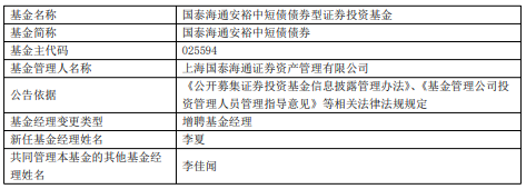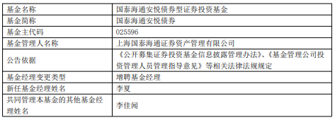 中国经济网北京12月23日讯 今日,上海国泰海通证券资产管理有限公司公告,国泰海通安悦债券、国泰海通安裕中短债债券增聘李夏。
