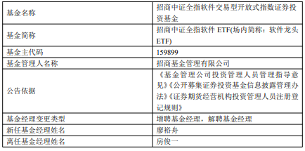 中国经济网北京12月25日讯 今日,招商基金公告,招商中证全指软件ETF增聘廖裕舟,房俊一离任。