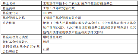 中国经济网北京12月25日讯 今日,工银瑞信基金公告,工银1-3年农发债指数增聘杨晨。