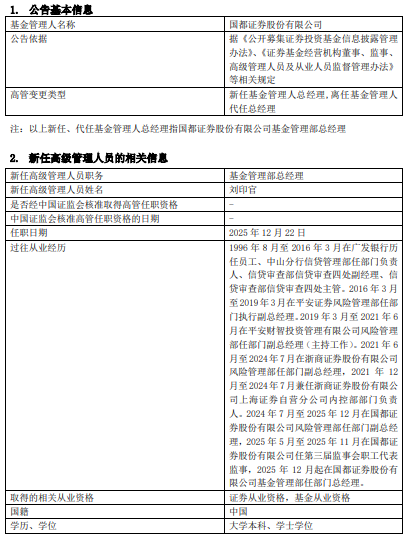 中国经济网北京12月25日讯 今日,国都证券公告,任命刘印官为基金管理部总经理,廖晓东因临近退休年龄离任。