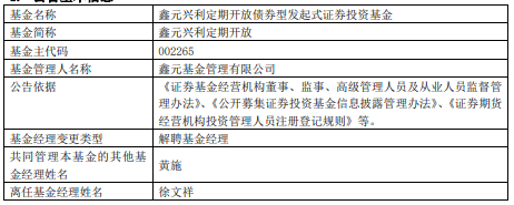 中国经济网北京12月26日讯 今日,鑫元基金公告,徐文祥离任鑫元兴利定期开放。