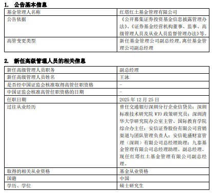 中国经济网北京12月29日讯 近日,红塔红土基金公告,任命王泳为副总经理,原副总经理周国菁退休。