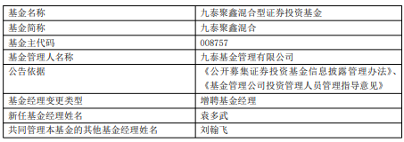 中国经济网北京12月30日讯 昨日,九泰基金公告,九泰聚鑫混合增聘袁多武。