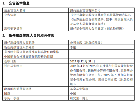 中国经济网北京1231日讯 今日,招商基金公告,任命李刚为公司首席(副总经理级)。