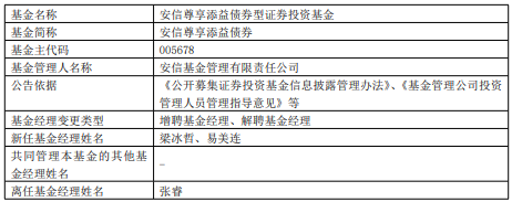 中国经济网北京12月31日讯 今日,安信基金公告,安信尊享添益债券增聘梁冰哲、易美连,张睿离任。
