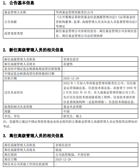 中国经济网北京1月5日讯 近日,华西基金管理有限责任公司公告,任命范建伟为首席信息官,徐浪离任。