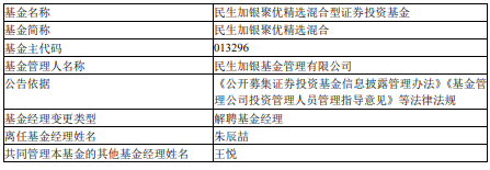 中国经济网北京1月5日讯 近日,民生加银基金公告,朱辰喆离任民生加银聚优精选混合。