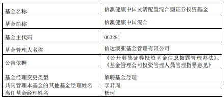 中国经济网北京1月5日讯 近日,信达澳亚基金公告,杨珂离任信澳健康中国混合,李君周管理。
