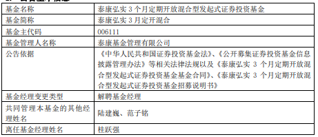 中国经济网北京1月6日讯 今日,泰康基金公告,桂跃强离任泰康弘实3月定开混合。