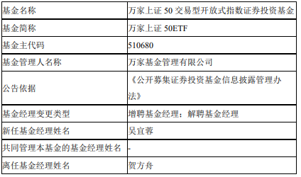 中国经济网北京1月7日讯 今日,万家基金公告,万家上证50ETF增聘吴宜蓉,贺方舟离任。
