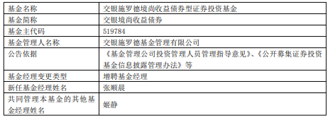 中国经济网北京1月8日讯 今日,交银施罗德基金公告,交银境尚收益债券增聘张顺晨。