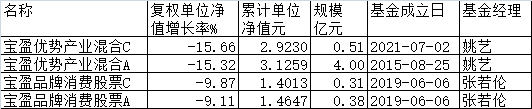 由姚艺管理的宝盈优势产业混合C、宝盈优势产业混合A全年分别下跌15.66%和15.32%。资料显示,姚艺2011年6月至2017年6月在华泰证券股份有限公司担任高级研究员,2017年6月加入宝盈基金管理有限公司,历任高级研究员、基金经理助理,2021年3月9日起担任基金经理。