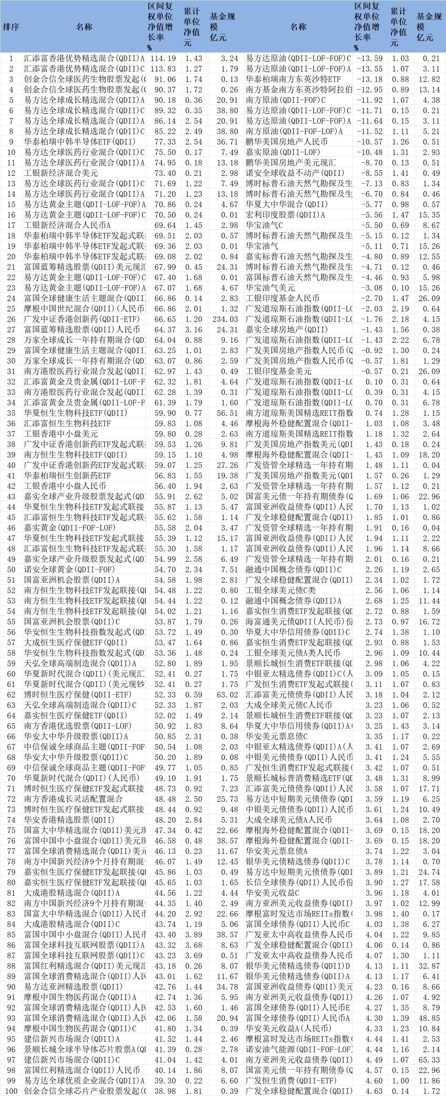 2025年QDII基金涨跌幅前100名