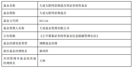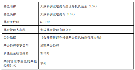 中国经济网北京1月14日讯 今日,大成基金公告,大成领先动力混合、大成互联网思维混合、大成科创主题混合(LOF)增聘郭玮羚。