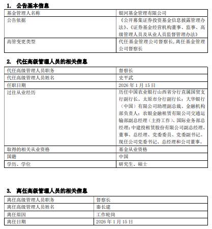 中国经济网北京1月19日讯 近日,银河基金公告,史平武代任督察长,秦长建离任。