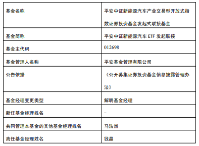 中国经济网北京1月20日讯 今日,平安基金公告,钱晶离任平安中证新能源汽车ETF发起联接、平安中证新能源汽车产业ETF、平安中证汽车零部件主题ETF。