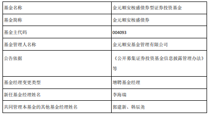 中国经济网北京1月20日讯 今日,金元顺安基金公告,金元顺安桉盛债券增聘李海瑞。