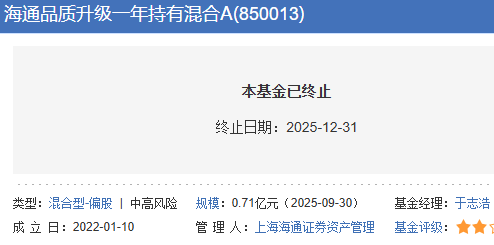 截至2025年12月31日最后一次披露净值日,海通品质升级一年持有混合A/C的累计单位净值为2.6425元、2.5948元,累计收益率为-20.28%、-21.72%。