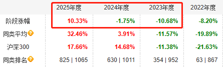 但在2023年至2025年这三年里,该基金在陈涛独自管理下收益率分别为-10.68%、-1.75%、10.33%,而同期同类产品均值却是-11.57%、3.91%、32.46%,后两年的表现明显落后同类均值水平。尤其是在大牛市的2025年里,该基金比同类产品均值水平落后了20个百分点。