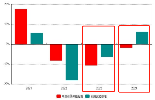 同样的,在已发布的2023年和2024年年报里,中庚价值先锋股票的年度收益率表现也不及业绩比较基准。
