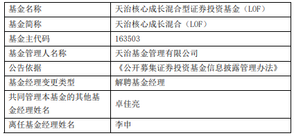 中国经济网北京1月23日讯 今日,天治基金公告,李申离任天治核心成长混合(LOF),卓佳亮管理。